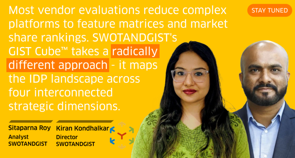 “Most vendor evaluations reduce complex platforms to feature matrices and market share rankings. SWOTANDGIST’s GIST Cube™ takes a radically different approach – it maps the IDP landscape across four interconnected strategic dimensions,” write Sitaparna Roy, Analyst at analyst firm SWOTANDGIST, and Kiran Kondhalkar, Director at SWOTANDGIST. Stay tuned for their opinion piece next week to find out what these four interconnected strategic dimensions are.